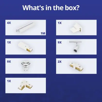 | Fabrikantnaam | Complete L shaped 1-Phase Track Set White incl. 9x Spot fixture + GU10 2700K 3W Dim – 2 x 2 meters i | |